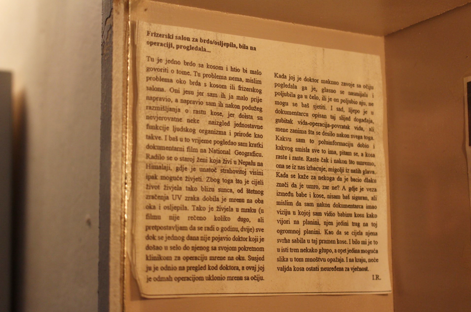 Istaknula bih Frizerski salon za brdo autora Igora Rufa. Bilo je teško protumačiti što ova audiovizualna instalacija predstavlja, a ta faza i dalje traje. Dakako, iza djela se krije i priča. Riječ je o multimedijalnom eksperimentu temeljenom na dokumentarcu o ženi koja živi u Nepalu gdje je zbog jakog UV zračenja oslijepila, bila na operaciji i na koncu progledala. Glavni protagonist je, ni više ni manje, – brdo. Brdo s kosom! Umjesto uobičajenog raslinja to brdo ima kosu, a smješteno je unutar vintage frizerskog salona. Što reći nego – to morate vidjeti uživo vlastitim očima.