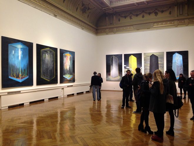 Najdominantnija tema slikarske interpretacije na izložbi “Kontrola iluzije” su elementi suvremene arhitekture. Ovu temu susrećemo u ciklusima slika Toranj S.D.C.O 1, Toranj S.D.C.O 2, Toranj S.D.C.O 3 i Toranj S.D.C.O 4, te Mašina 1, Mašina 2, Mašina 3 i Mašina 4. Slike su velikih formata, 200 x 250 cm. Boje koje prevladavaju na slikama su tamnoplava, siva i crna, s ponekom neočekivanom primjenom jarkih tonova žute, crvene i narančaste. Naslikani prostor nema dubinu, plošan je, ali unatoč tome se prikazani izdvojeni elementi arhitekture podređuju geometrijskoj perspektivi. Osim urbane arhitekture, kao teme se pojavljuju obitelj, na slikama Obitelj 1, Obitelj 2, Obitelj 3 i moderna tehnologija, na slikama Kontrola 1, Kontrola 2 i Kontrola 3, Klopka, te Ništa 1, Ništa 2 i Ništa 3.