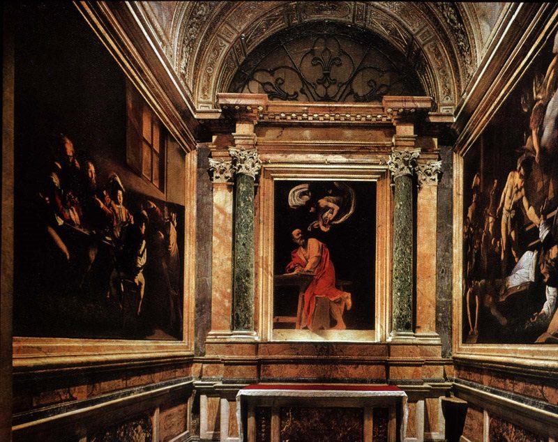Crkveni krugovi još su jedno Caravaggiovo djelo označili kao nedovoljno dobro. Naime, mladi je Caravaggio 1599. godine dobio svoju prvu veliku narudžbu za oslikavanje kapele Contarelli u crkvi Luigi dei Francesci. Narudžba je uključivala dvije velike bočne slike, odnosno Poziv sv. Mateja i Mučeništvo sv. Mateja, te veliku oltarnu palu. Središnja je slika prikazivala sv. Mateja kako piše evanđelje. Međutim, naručitelji su ocijenili kako je umjetnik nedostojno prikazao sveca jer Matej izgleda kao da ne zna što radi i kao da njime upravlja anđeo. Caravaggio je morao naslikati novu oltarnu palu na kojoj je sv. Matej prikazan kao svetac dostojan Božje riječi, iako ju i danas neki kritičari označavaju kao nespretnu izvedbu.