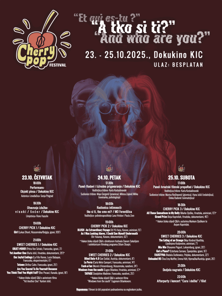U vremenu u kojem se mnoge seksualne i rodne manjine i dalje osjećaju marginalizirano i nezaštićeno 4. izdanje Cherry Pop Festivala ponovno otvara prostor za umjetničko i znanstveno promišljanje o seksualnosti, identitetu i intimnosti. Ovogodišnja tema, A tko si ti?, poziva na introspekciju i razumijevanje različitosti kroz film, razgovor, umjetnost i glazbu.