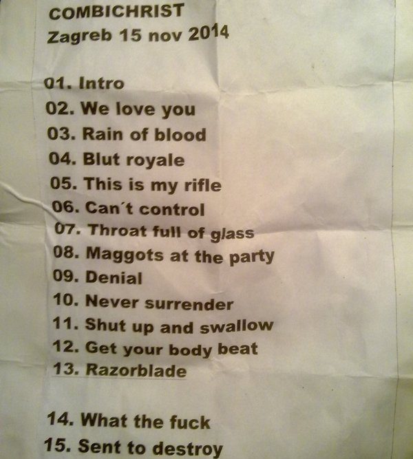 Zagrebački je nastup po svemu ostalome bio genijalan. Presjek kompletne karijere bez prvog albuma i bez nekoliko mojih osobnih favorita udovoljio je kompletnoj publici. Začudo nije bilo pretjerane gnjavaže s novim albumom, ali Combichrist je uvijek bio bend koji je znao složiti set-listu. Subotnju možete naći na slici ispod. Kolegica je bila toliko divna da je užicala ovaj komad papira koji nije potpuno točan. Nastup je završio s bisom na kojem su se našle Fuck That Shit (umjesto Sent To Destroy) i What The Fuck Is Wrong With You? Bend je poručio publici da ostanu u malom pogonu nakon zadnje stvari. Pomislih da respektira program Musica Obscura i Pure Electro (iako je kasnije ispalo da DJ ne zna za God Module), međutim oba benda su se pojavila u malom pogonu odmah nakon zadnje pjesme.