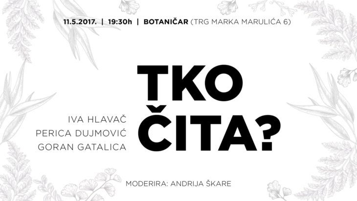 Program ‘Tko čita?’ u četvrtak, 11. svibnja u 19:30 sati održat će se na novoj lokaciji. U krasnom Botaničaru bit će ugošćeno troje sjajnih autora: jedna prozna autorica i dvojica pjesnika: Iva Hlavač, Perica Dujmović i Goran Gatalica. Moderirat će Andrija Škare.