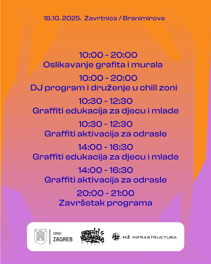 Program započinje u 10 sati ujutro, a posjetitelje očekuje bogat sadržaj. Tridesetak umjetnika iz cijele Hrvatske i regije oslikavat će potporne stupove mosta. Radionice za sve generacije vodit će graffiti pionir Krešimir Golubić (Leon GSK) te umjetnica i dizajnerica Antonija Bačić, koji će zainteresiranima približiti tehnike i filozofiju ulične umjetnosti.
